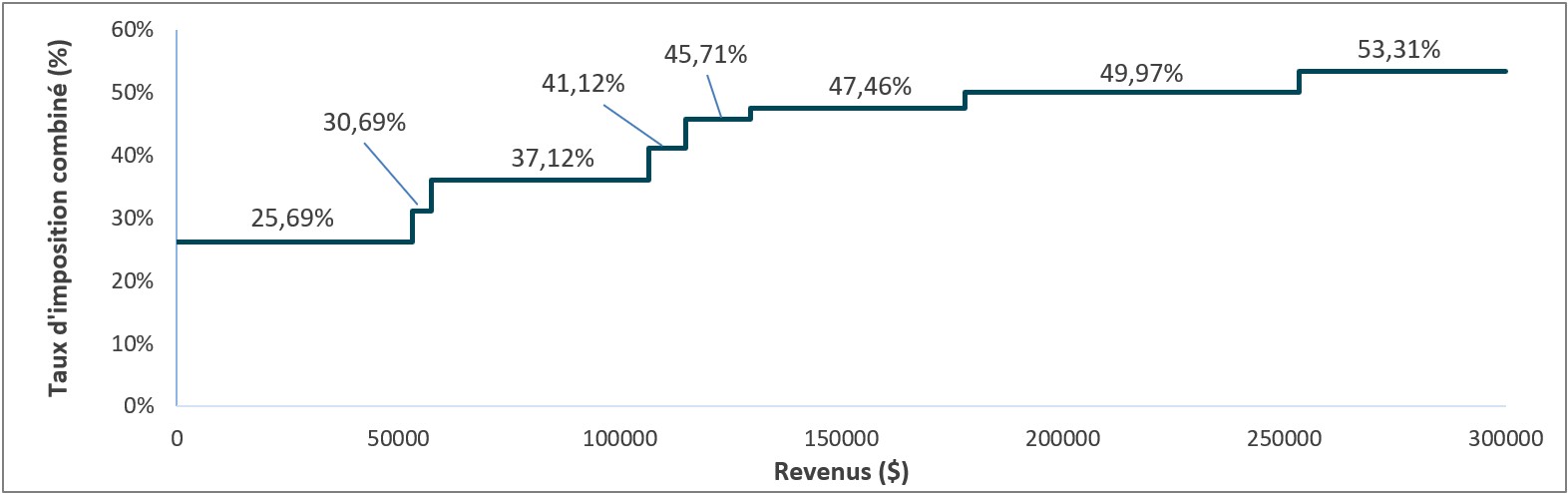 Les contribuables québécois doivent composer avec huit taux nominaux d’imposition du revenu des particuliers, qui débutent à 26,11 % (25,69 % en 2026) et continuent à progresser jusqu’à atteindre 53,31 % pour la tranche de revenus supérieurs à 253 414 $ (258 482 $ en 2026).
