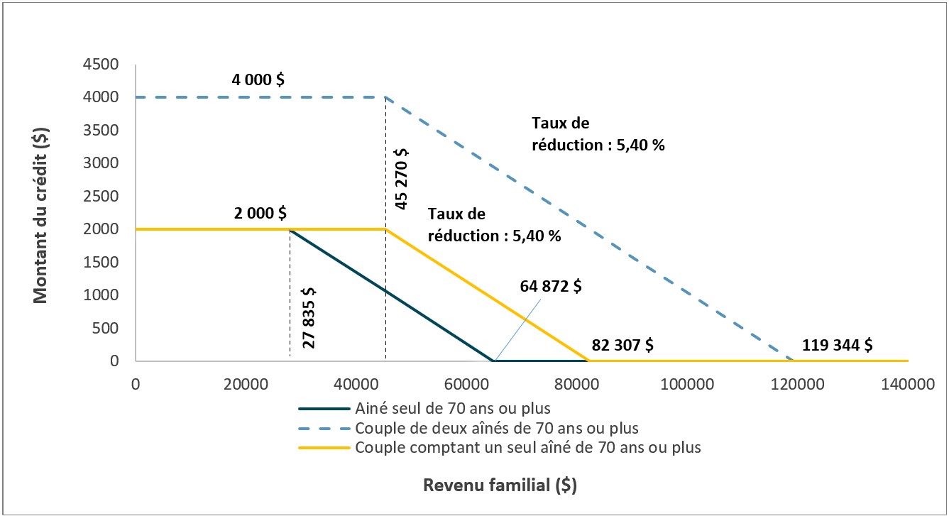 Ainsi, les aînés seuls de 70 ans ou plus bénéficient du plein montant de 2 000 $ jusqu’à un revenu familial de 27 835 $. À compter de ce revenu, l’aide est progressivement réduite jusqu’à un revenu de 64 872 $.
