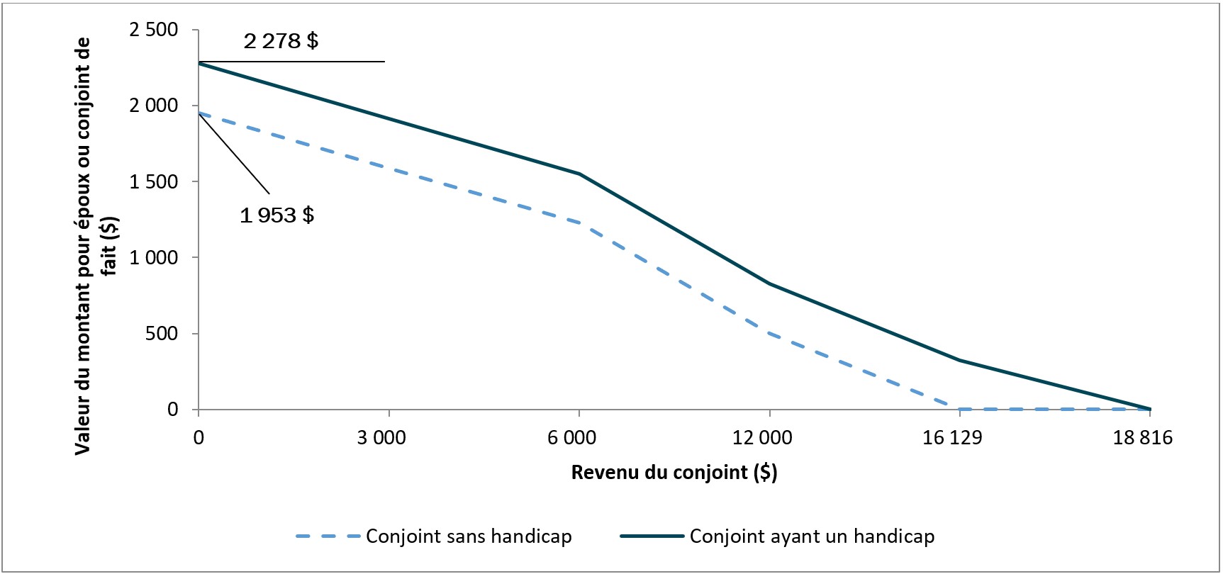 Si le revenu de la personne à charge est nul et que cette dernière souffre d’une déficience mentale ou physique, la valeur maximale du crédit est plutôt de 2 279 $. Le crédit est également diminué du même montant que le revenu de la personne à charge admissible. Le crédit est réduit à 0 $ lorsque le revenu de la personne à charge admissible handicapée atteint 18 816 $.