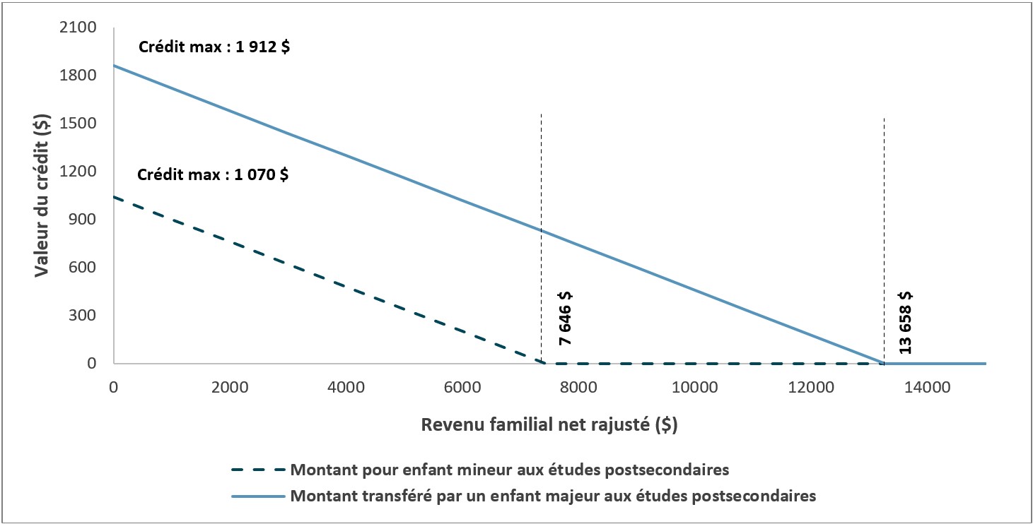 Le graphique suivant illustre la variation du montant maximal des crédits pour montant pour enfant mineur aux études postsecondaires et pour montant transféré par un enfant majeur aux études postsecondaires en fonction du revenu de l’enfant aux études postsecondaires.