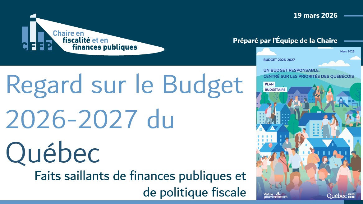 Le Budget du Québec est au cœur du travail de la Chaire en fiscalité et en finances publiques (CFFP). Chaque année, l’équipe de la Chaire examine les documents budgétaires d’un couvert à l’autre. L’analyse initiale est présentée sous la forme d’un Regard sur le budget qui décortique ce que l’équipe considère être les faits saillants de finances publiques et de politique fiscale du budget présenté le 18 mars 2026.